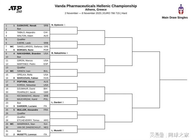 穆塞蒂的雅典征程注定不易。他作为二号种子,首轮轮空,但此后可能接连面对斯坦·瓦林卡或范德尚舒普等强手;四分之一决赛可能对阵扬-伦纳德·施特鲁夫或亚历山大·穆勒;半决赛的潜在对手则是安德烈·达尔德里或塞巴斯蒂安·科达;最严峻的挑战可能来自决赛,对手很可能是头号种子德约科维奇。